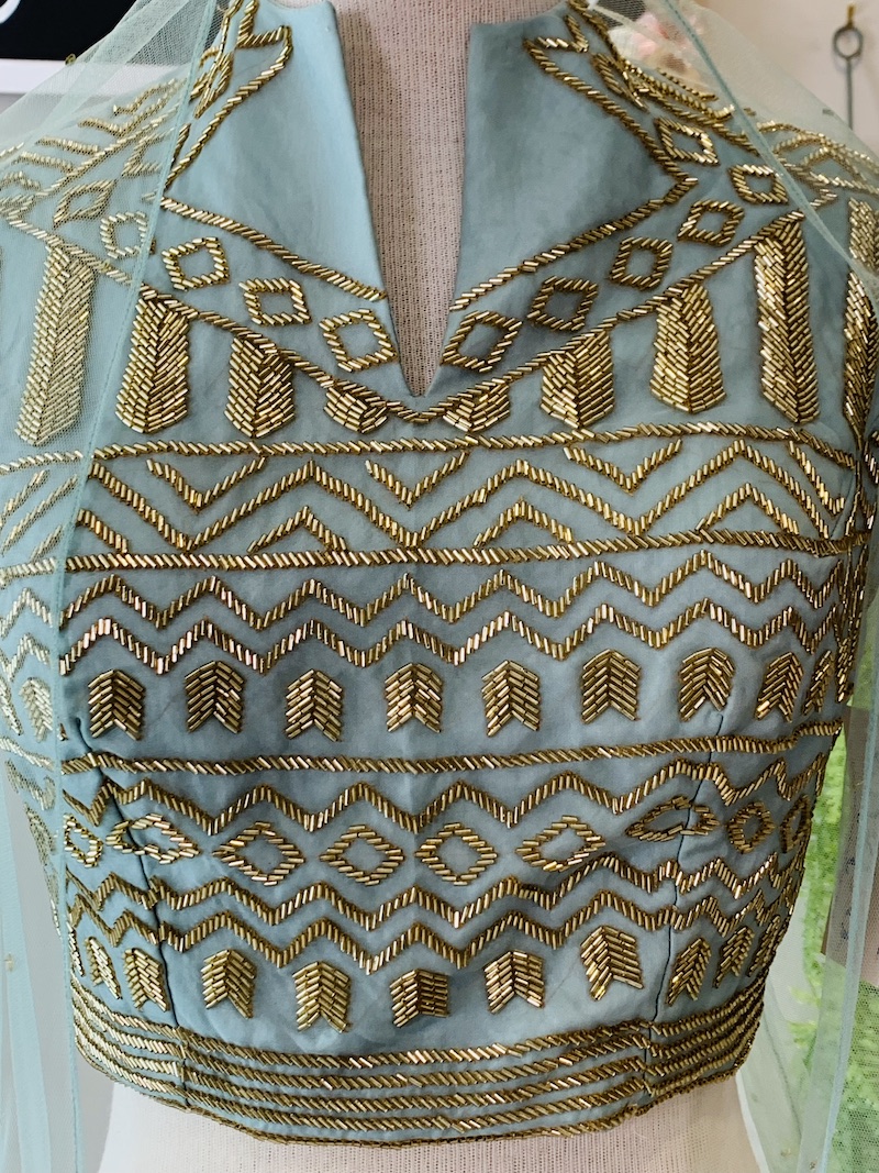 Lehenga Size: Large Blouse Size: 38 with margin upto size 40″ . Fabric: High end sateen silk with organza fabric