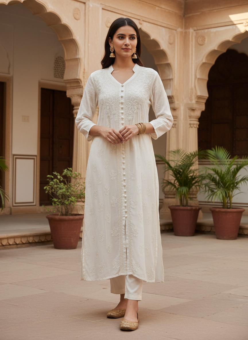 Beautiful Lucknowi Kurta size 38 Medium in soft muslin fabric. Hand embroidered and skillfully stitched by the artisans in Lucknow India.