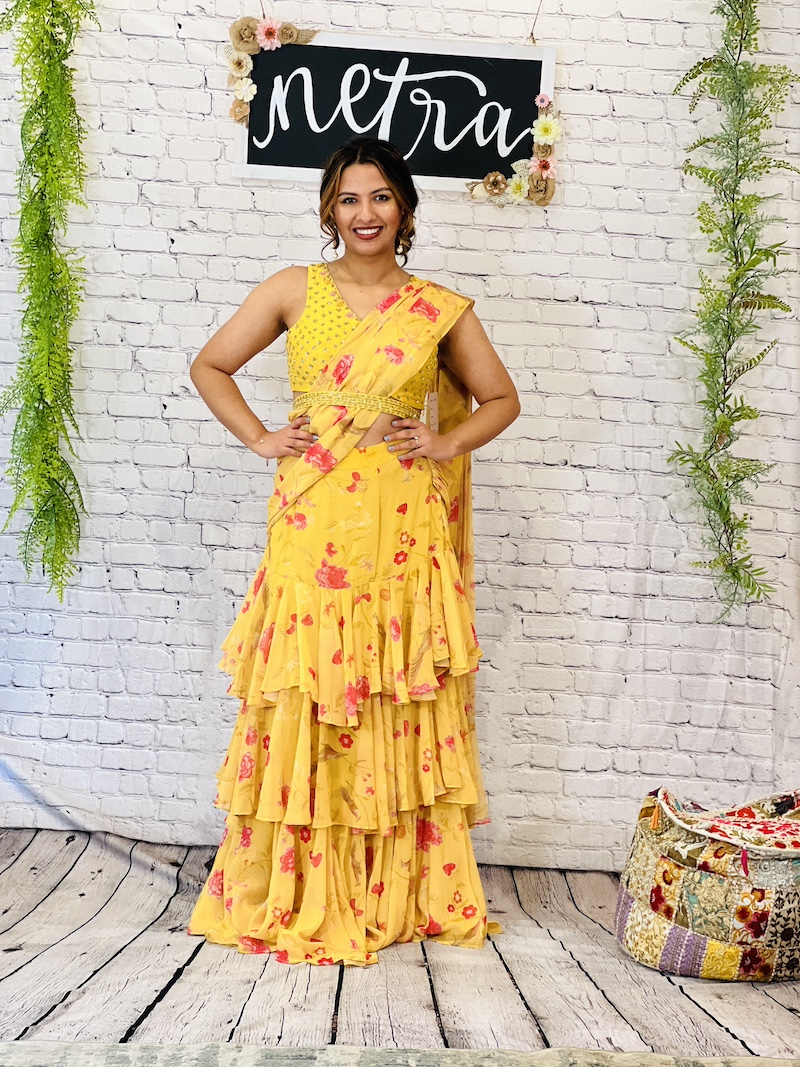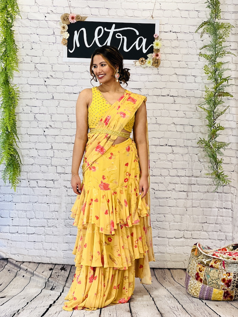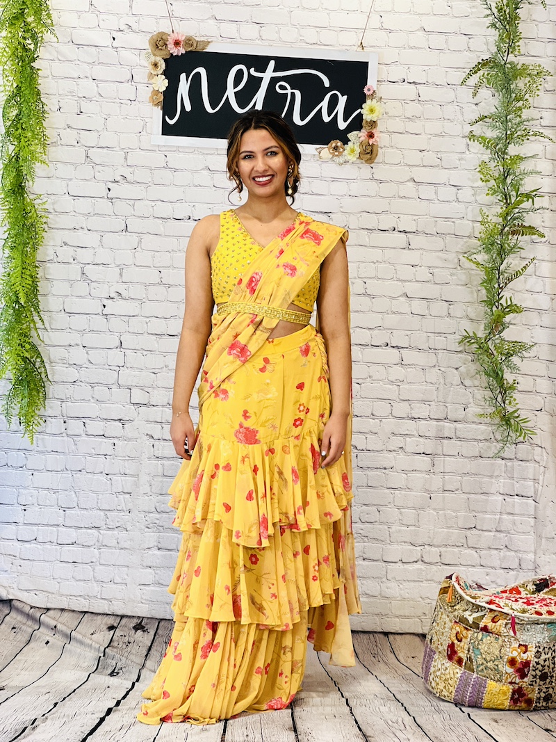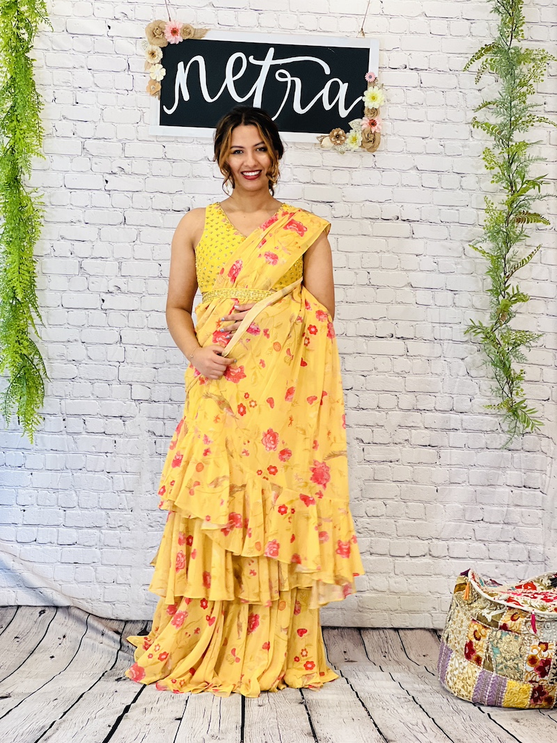 Embroidered georgette pre draped ruffle saree Size 38