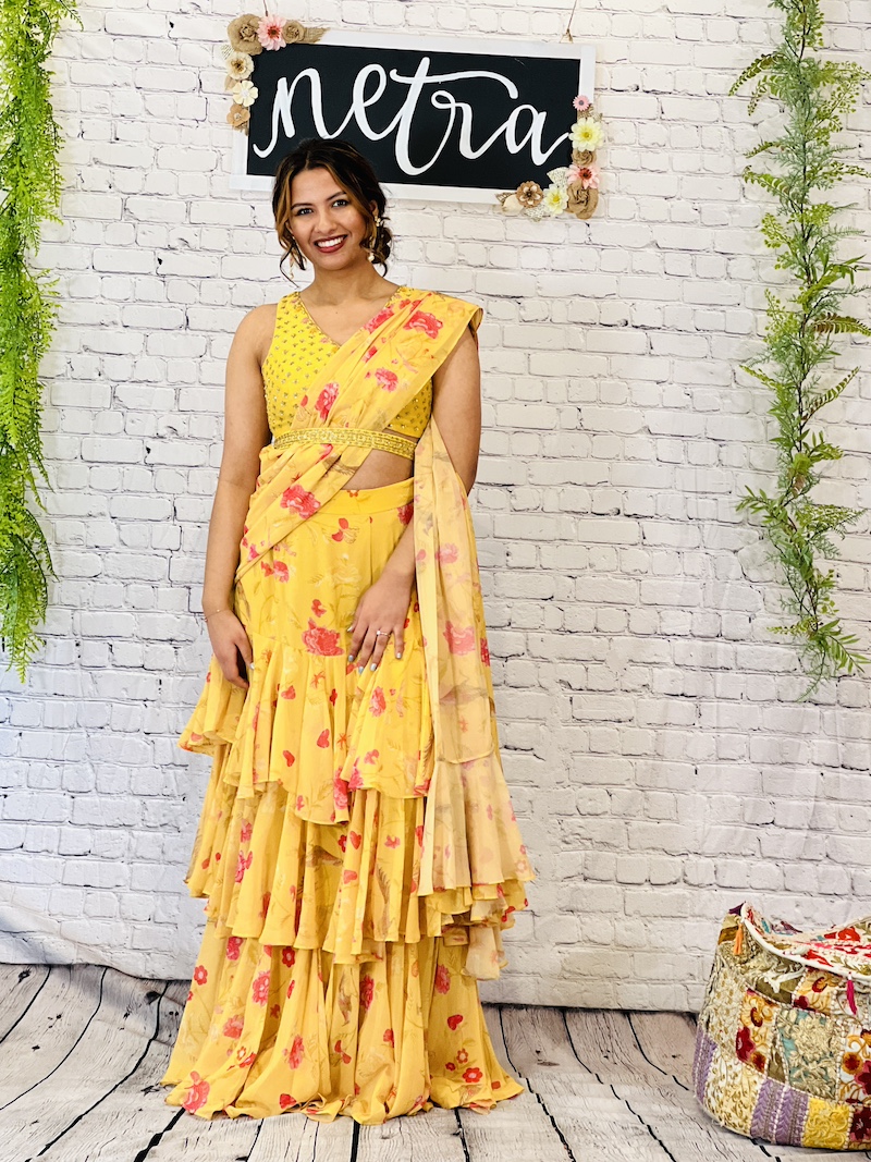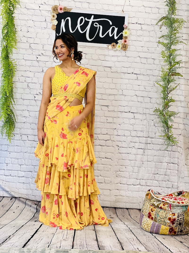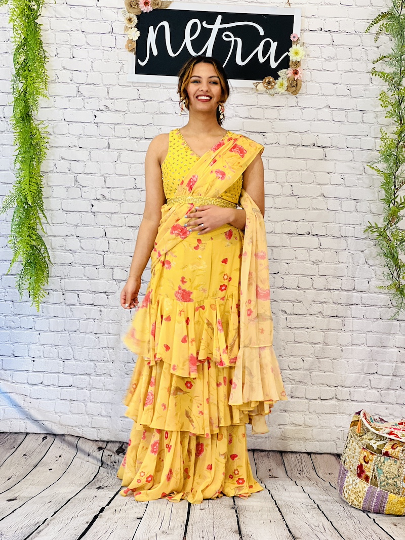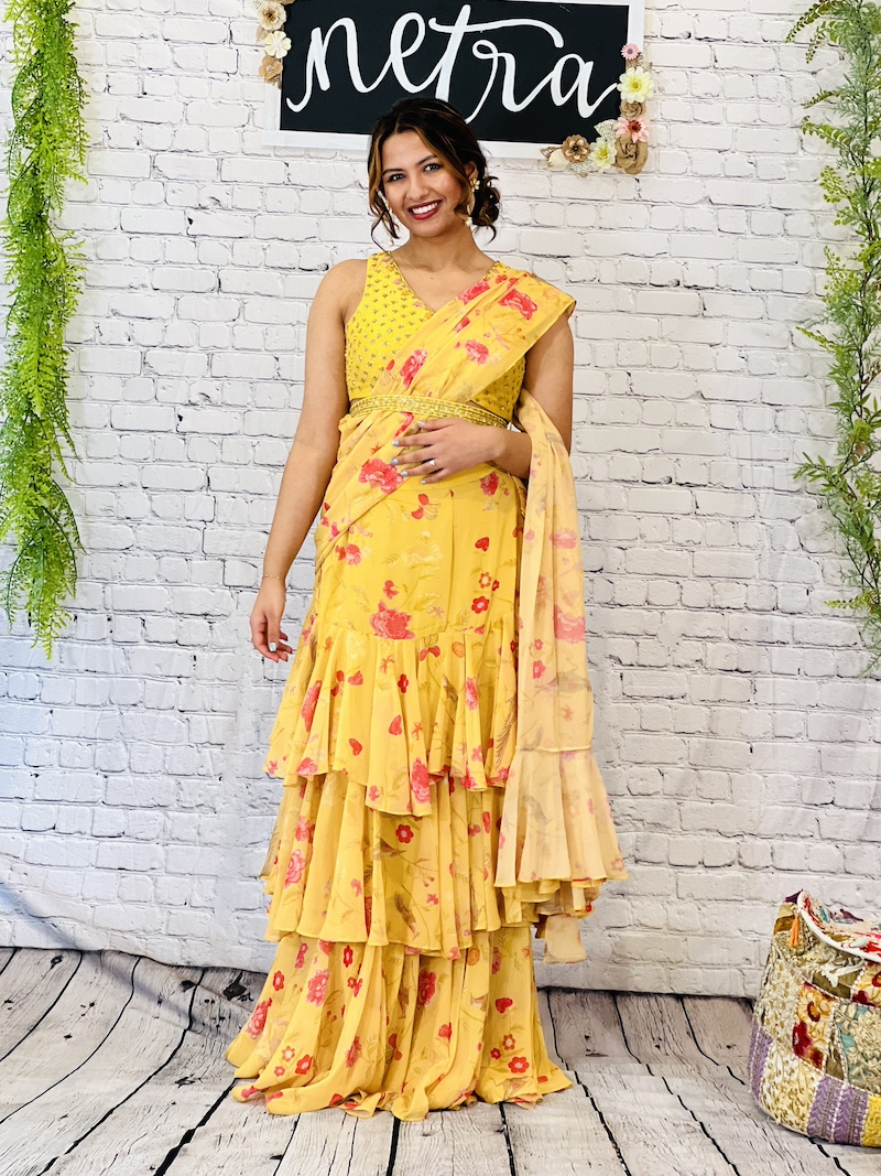 Embroidered georgette pre draped ruffle saree Size 38
