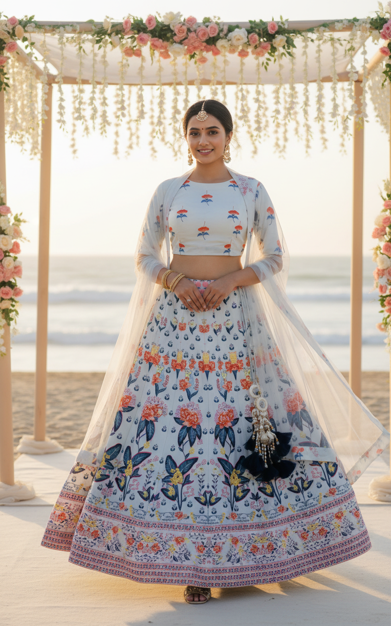 Beautiful floral print lehenga In high quality wrinkle resistant cotton blend fabric. Perfect to wear at a beach wedding or summer events. Can be dressed up or dressed down by adding jewelry and accessories. Please see the description for additional product details. Any question feel free to drop us an email.