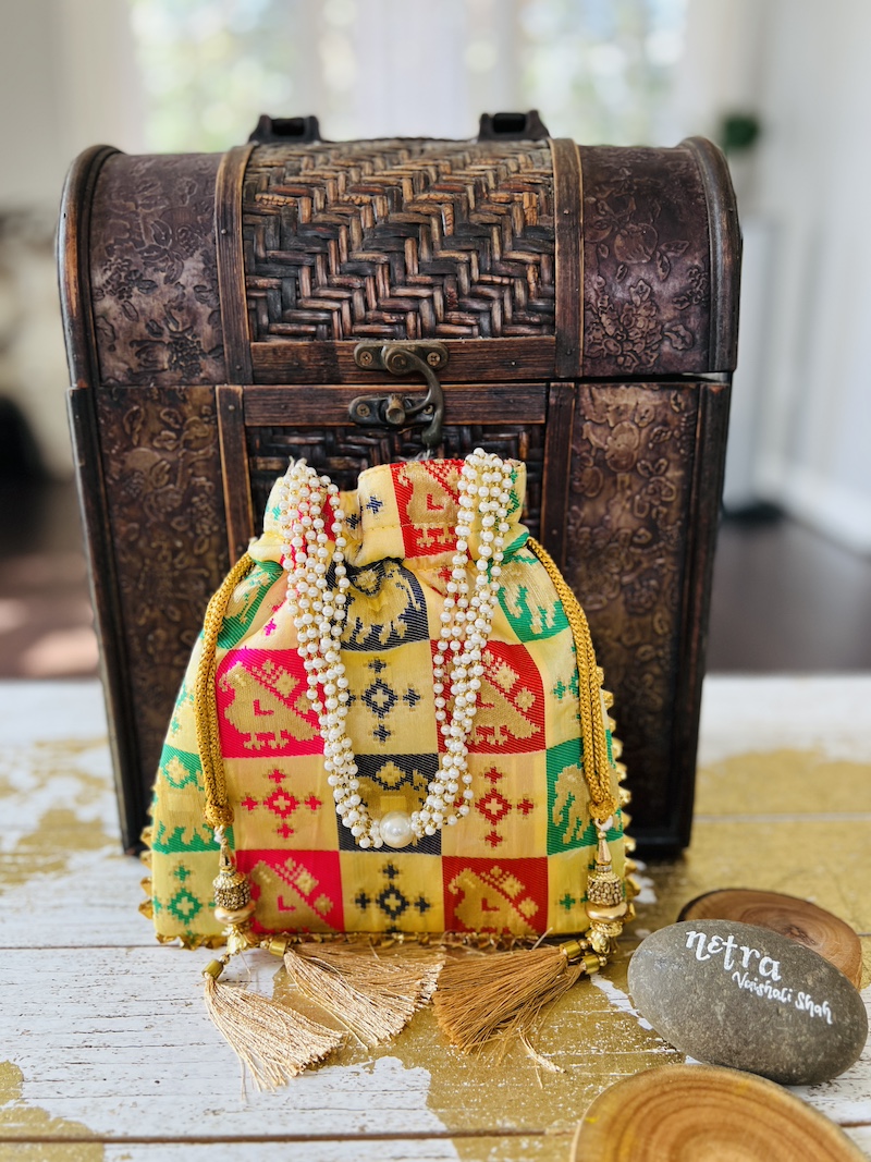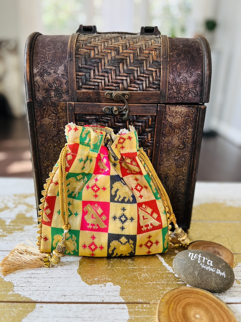 Patola silk woven potli bag. Please see product description for additional details or feel free send us an email.