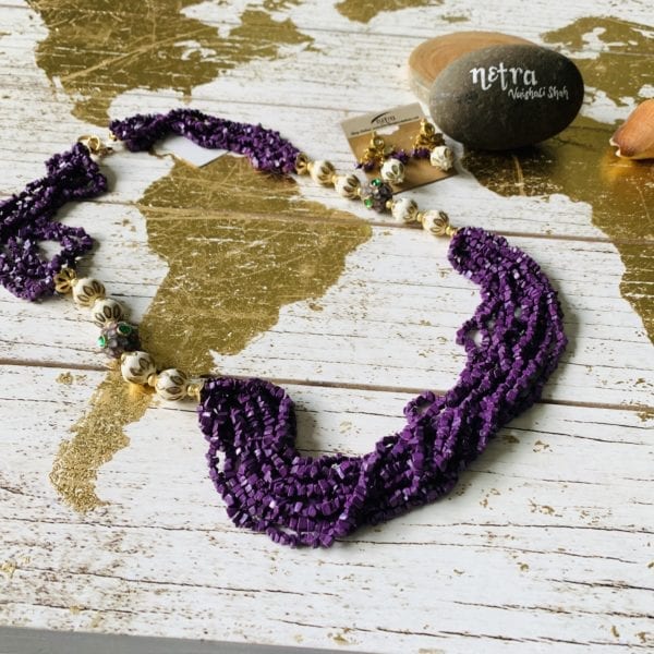Long semi precious and jadau beads necklace and earrings set. Perfect for dressing up a simple outfit. Comes with a pair of statement earrings and necklace that stands high on the neck. Please see product description for additional details or feel free send us an email.