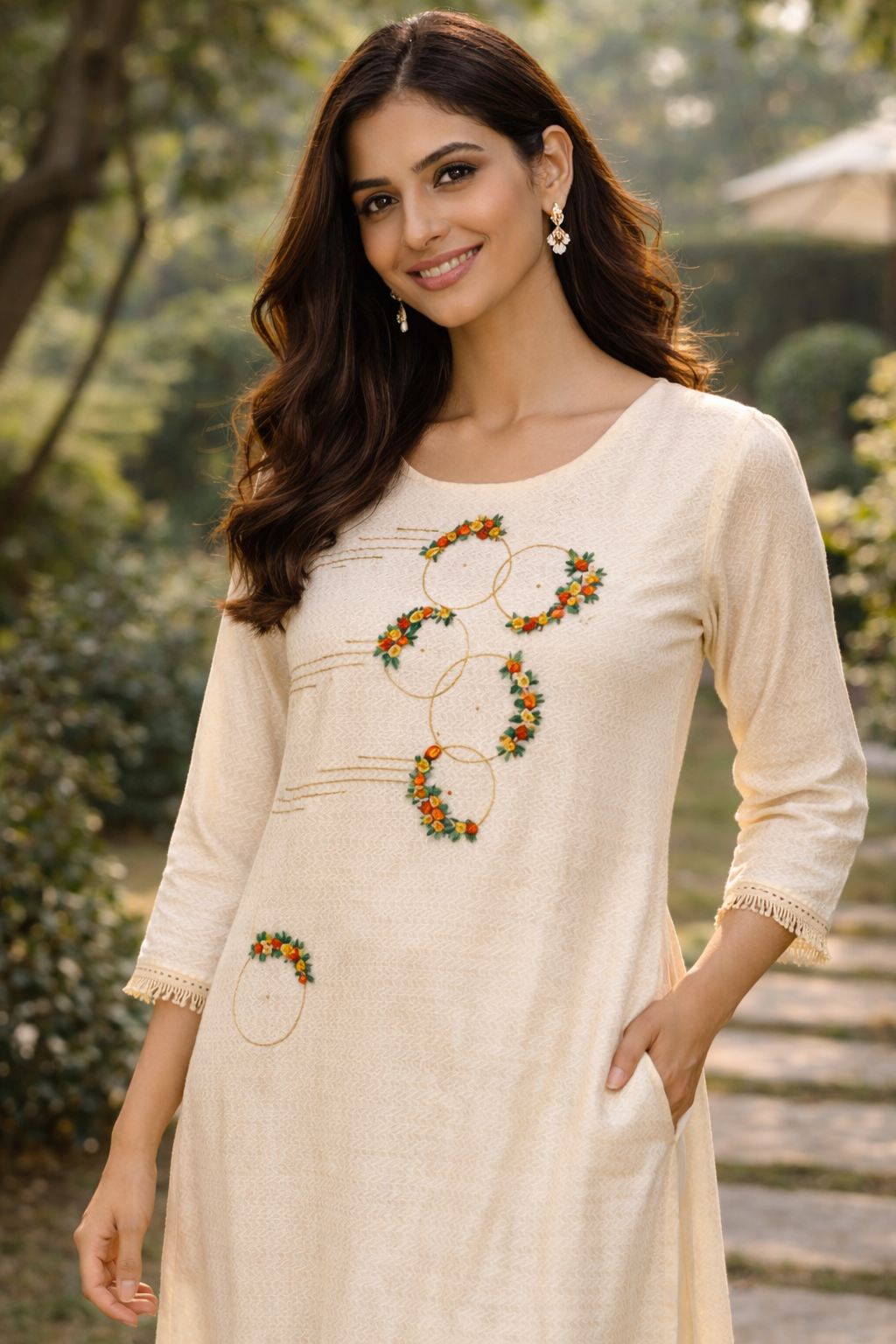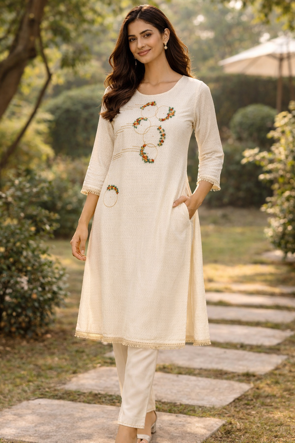 Off white embroidered long Kurta Top with fringe details Size 42 (X Large)