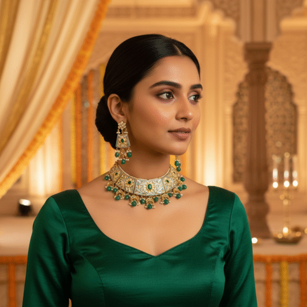 Traditional semi precious beads and jadau necklace set. Perfect for dressing up an outfit. Comes with a pair of earrings and a long necklace . Please see product description for additional details or feel free send us an email.